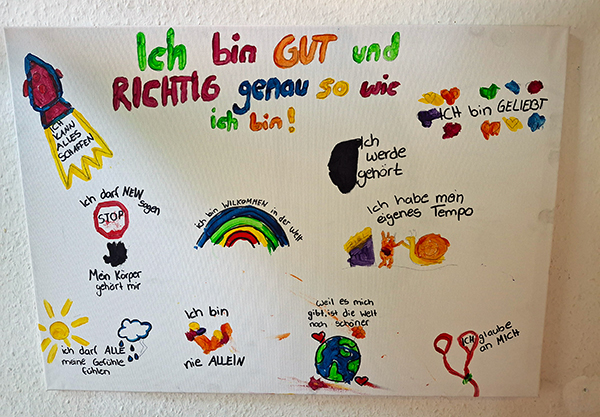 In einer weiteren Einrichtung haben die Vorschulkinder die Kinderrechte verbildlicht und es als Foto unter der Kinderrechtewand für Besucher veröffentlicht.