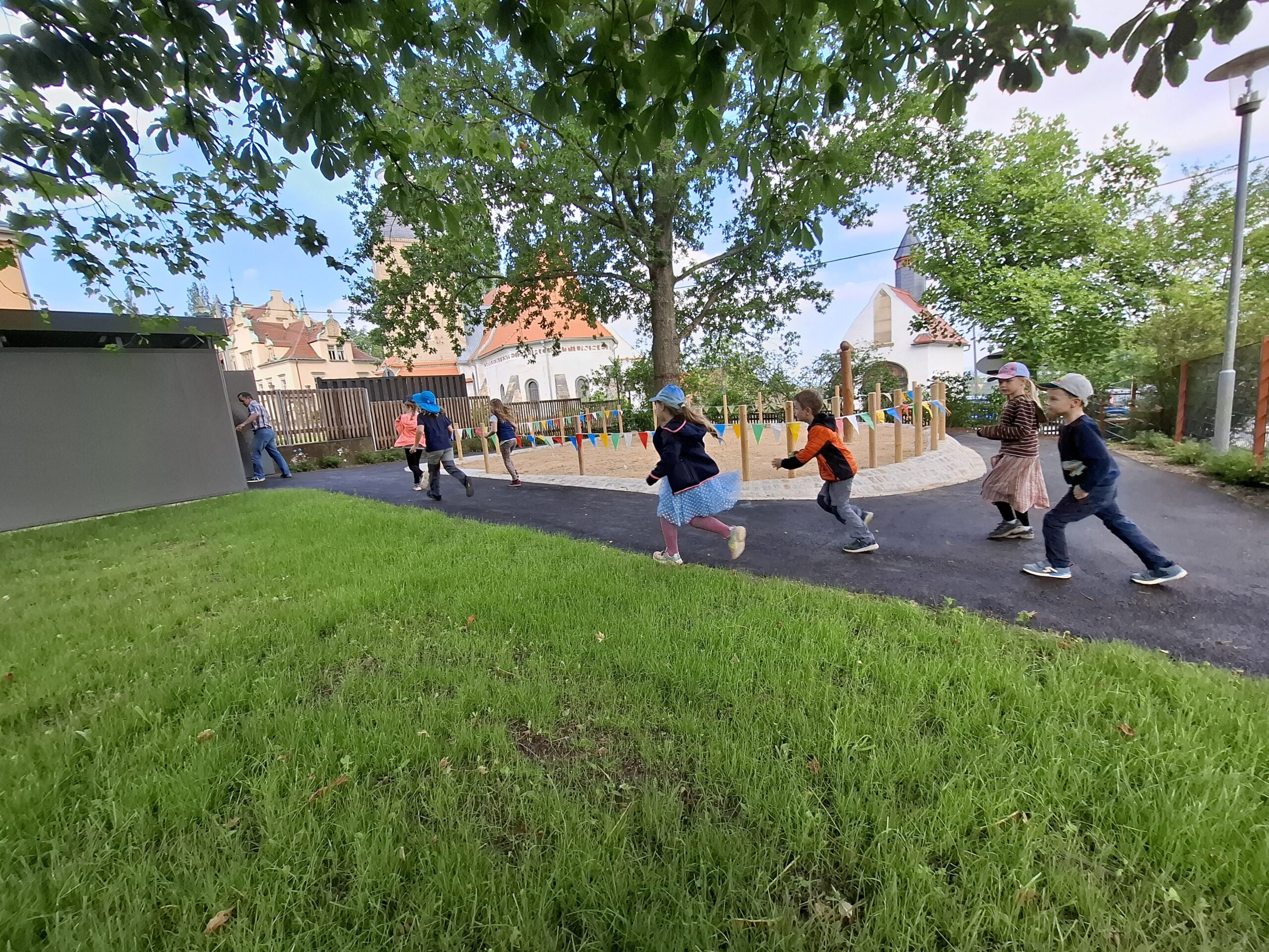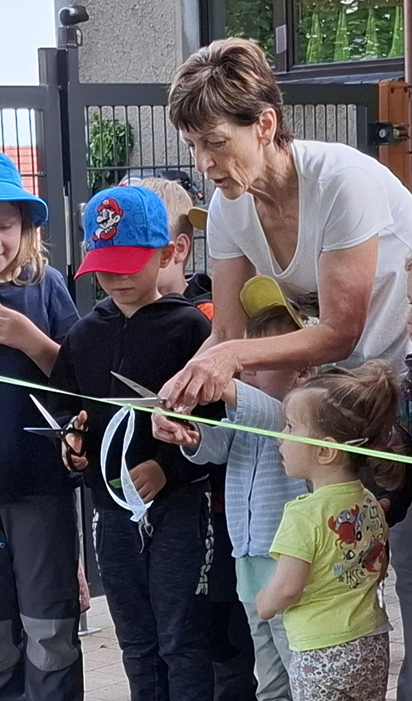 Umso größer war dann die Freude, als wir am 05.06. unser neues Außengelände in Betrieb nehmen durften. Zur feierlichen Eröffnung kam Herr Köhler von der Stadtverwaltung Pirna, Jana Salomon (Regionalleitung Sachsen Käpt´n Browser), die Landschaftsarchitektin Frau Viehrig, sowie einige Eltern der Kinder unserer Einrichtung. Einige kamen dabei nicht mit leeren Händen und haben anlässlich der Neueröffnung des Gartens Geschenke mitgebracht. Diese wurden von den Kindern ausgepackt und im Anschluss war es dann endlich soweit. Das Band wurde durchgeschnitten und alle Kinder rannten in das neue Außengelände. Die neue Fahrstrecke wurde gleich genutzt.