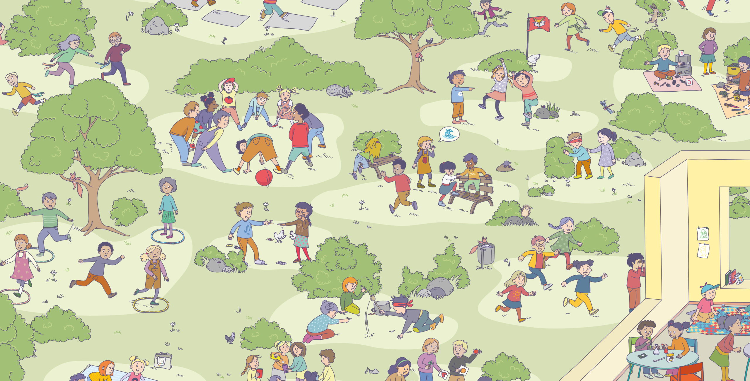 Teilhabe und Partizipation waren auch das Leitprinzip der grafischen Gestaltung der Ideenkarten: Jede Karte ist so illustriert, dass Kinder die Ideen wiedererkennen und selbst auswählen können. Kleine Suchbilder laden dazu ein wiedergefunden zu werden und erhöhen den spielerischen Aufforderungscharakter der Karten.