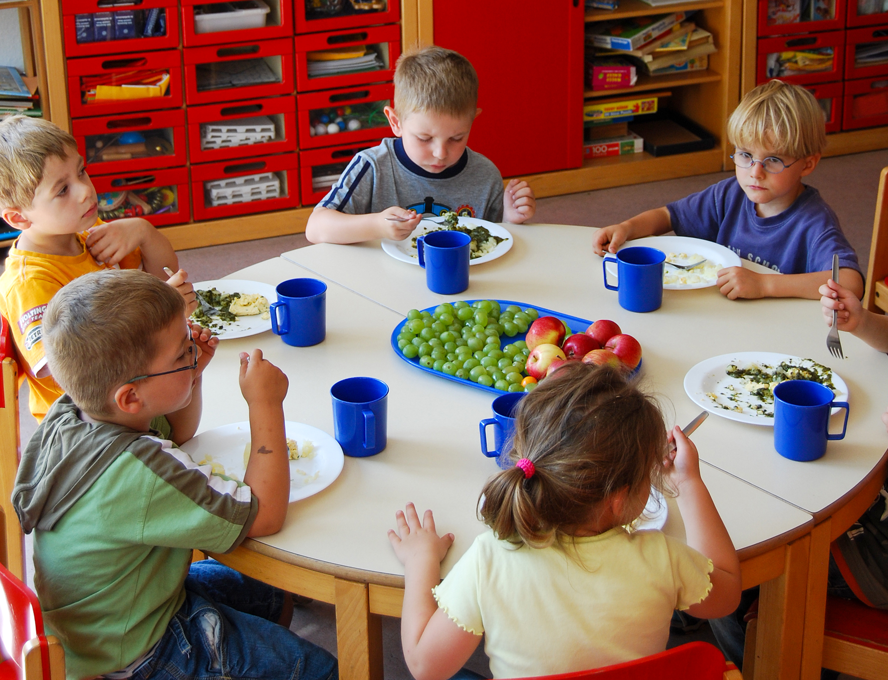 Mit einem kleinen Snack stärken sich die Kinder für den Nachmittag. Danach können sie drinnen oder draußen frei spielen, bis sie nach und nach abgeholt werden.