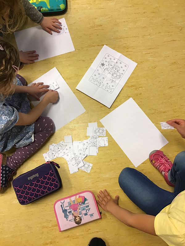 Zuerst mussten sie einige Aufgaben lösen. Es gab Briefumschläge, in denen verschiedene Puzzleteile verteilt waren. Aus diesen Teilen hat jedes Kind ein Mandala zusammengefügt, ausgemalt und aufgeklebt.