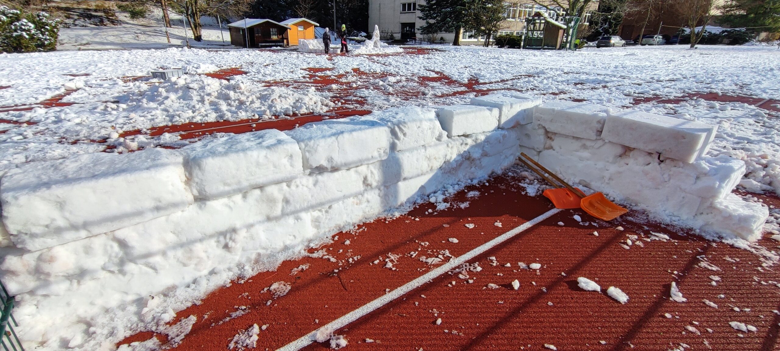 Der Schnee wurde mit Schneeschiebern gesammelt, um das weiße „Baumaterial“ restlos nutzen zu können. Dabei teilten sich die Kinder selbst in „Schnee-Transporter“ und in „Bauarbeiter“ ein. Gemeinsam entstanden so, oft auch Klassen übergreifend, tolle Bauwerke aus Schnee!