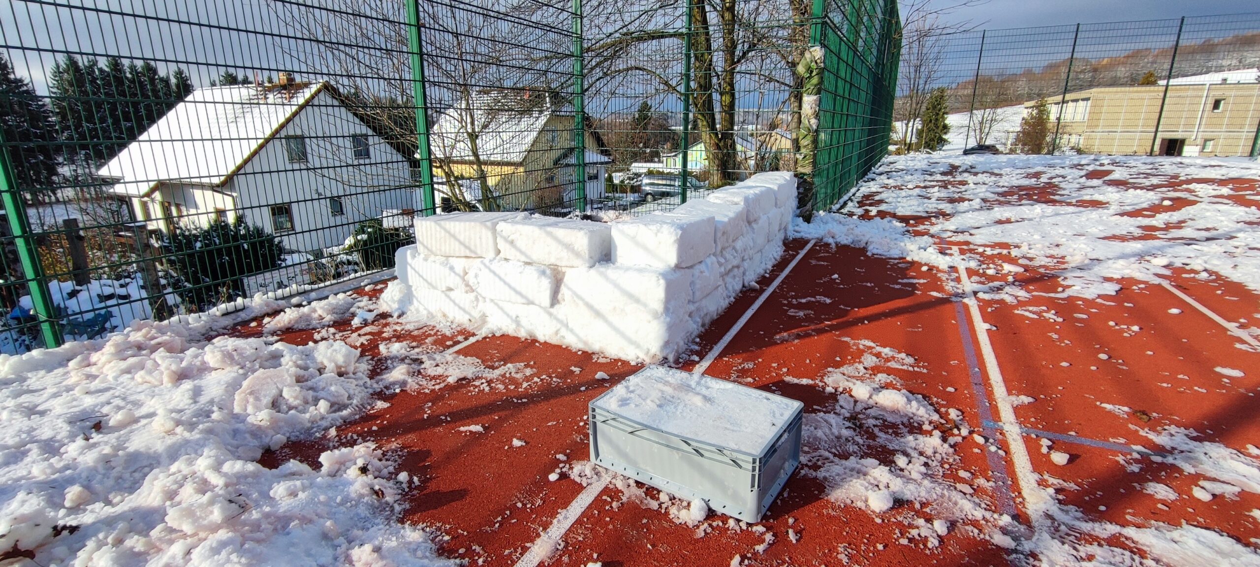 Mit Bäckerkisten, Töpfen und alten Gänsebrätern wurden Baukörper aus Schnee geformt, die in einer gemeinsamen Aktion zu einer Mauer wurden.