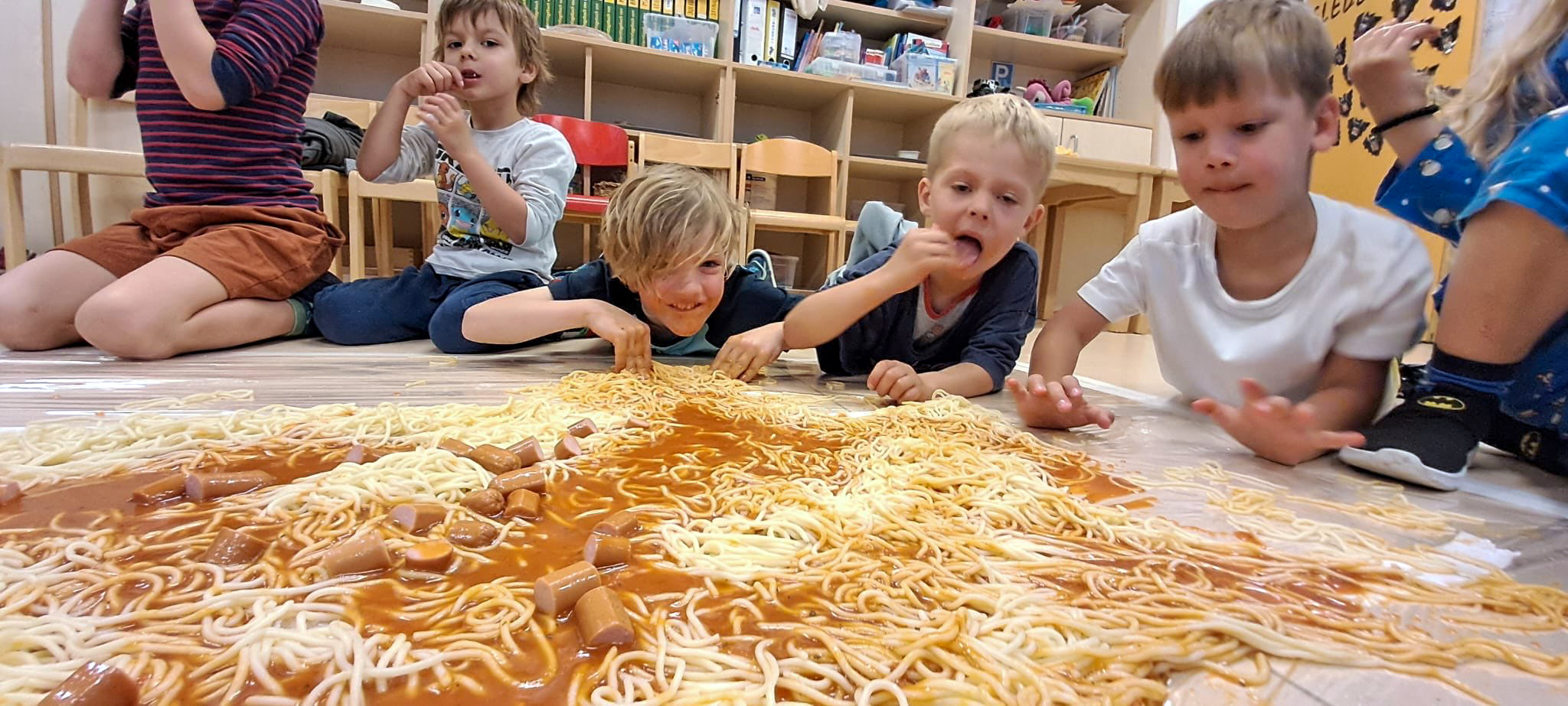Warum sollten die Kinder denn nicht Spaghetti vom Boden essen, im Schlafanzug in die Kita kommen oder im Gruppenraum auf einer Hüpfburg springen? Das waren einige der Vorstellungen und Wünsche, die von den Kindern zur Vorbereitung dieses besonderen Tages geäußert wurden. Mehr noch, an diesem Tag durften die Kinder bestimmen, was gegessen und getan wird und welche Regeln zu befolgen waren. So kam es, dass der Flur zum Flitzen freigegeben und der Sportraum in einen Kinosaal verwandelt wurde, wo die Kinder einen spannenden Film bei Salzstangen und Gummibärchen genossen.